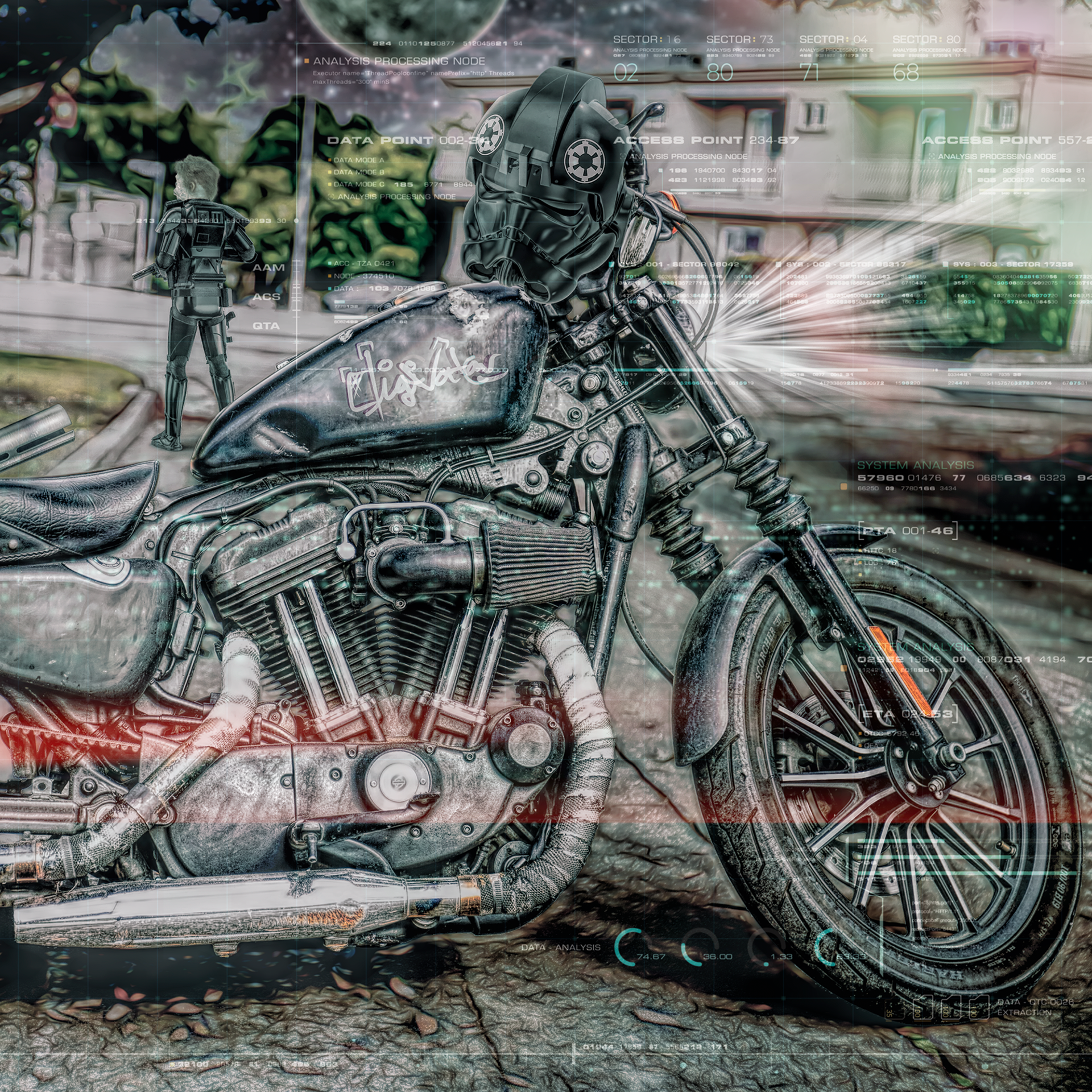 On the planet Zagis a bike raider stops, takes off his helmet and stands guard on the street.